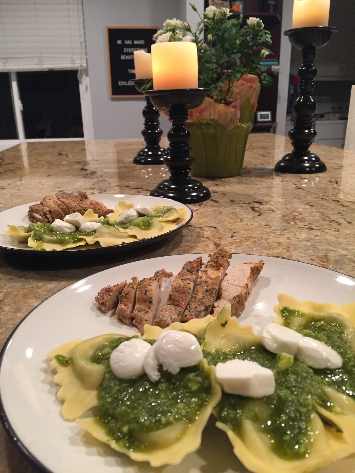 Cheese and Spinach Ravioli in Pesto sauce with grilled Tuscon chicken. Pared with lemon-garlic sautéed zucchini and squash.