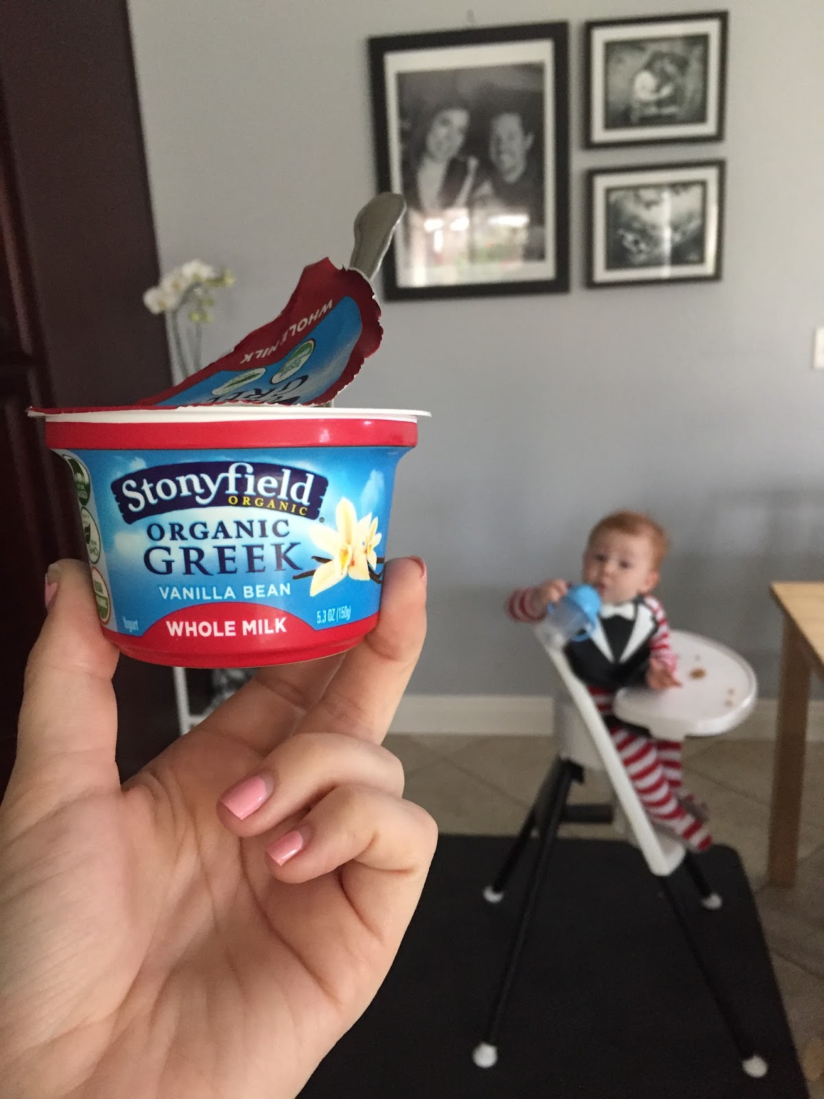 Stonyfield Yogurt with fruit and granola, always a good way to balance healthy nutrition with a busy morning.