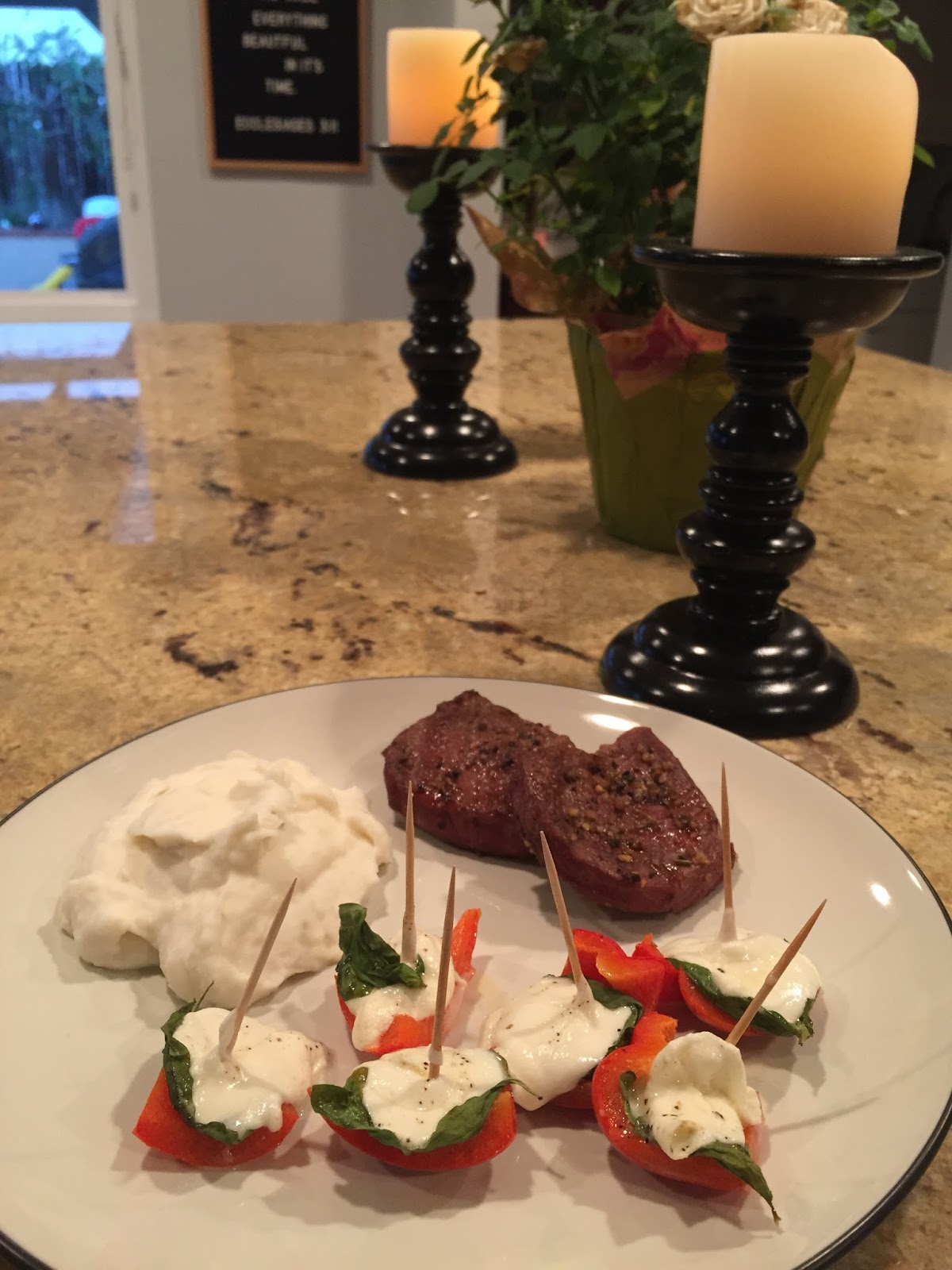 Juicy flank steak with mashed potatoes. Served with oven roasted bell peppers topped with fresh basil and mozzarella cheese, drizzled in EVOO and sprinkled with salt and pepper..