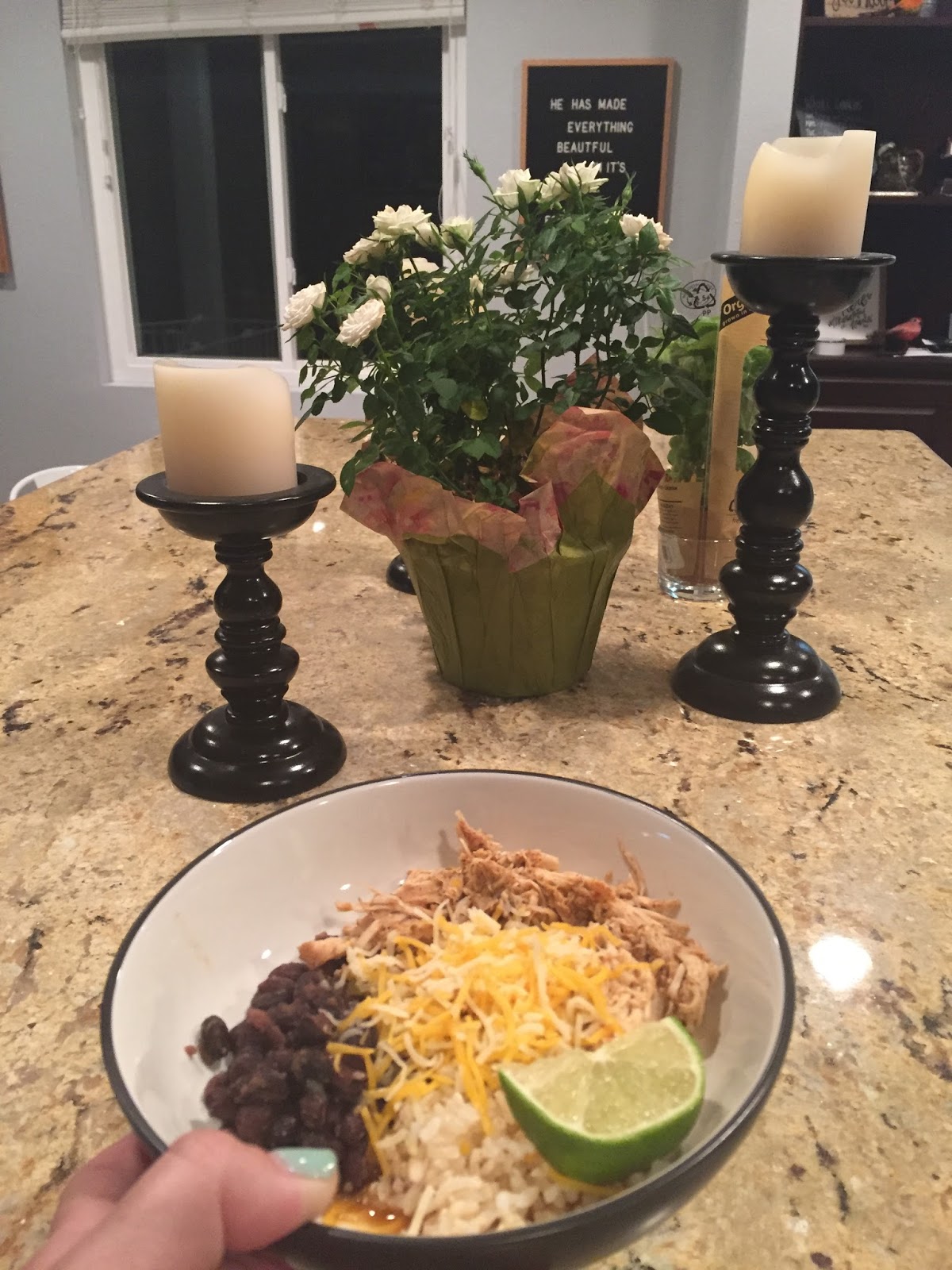 Shredded Chicken taco bowls, composed of my favorite Crock-pot shredded chicken, lime-cilantro brown rice, black beans, and shredded cheese with various toppings to choose from.